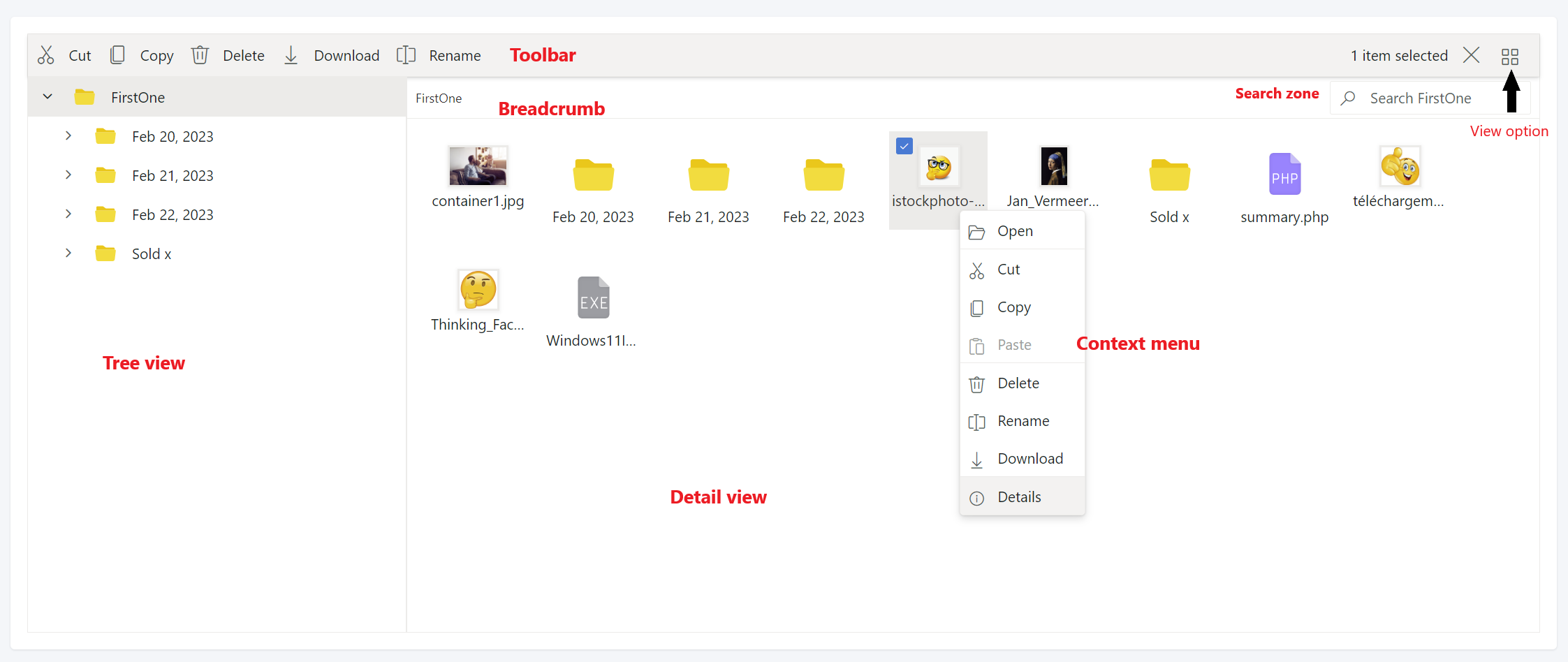 The context menu appears on user interaction such as right-click. The file manager is provided with context menu support to perform list of file operations with the files and folders. Context menu appears with varying menu items based on the targets such as file, folder (including navigation pane folders), and layout (empty area in view).