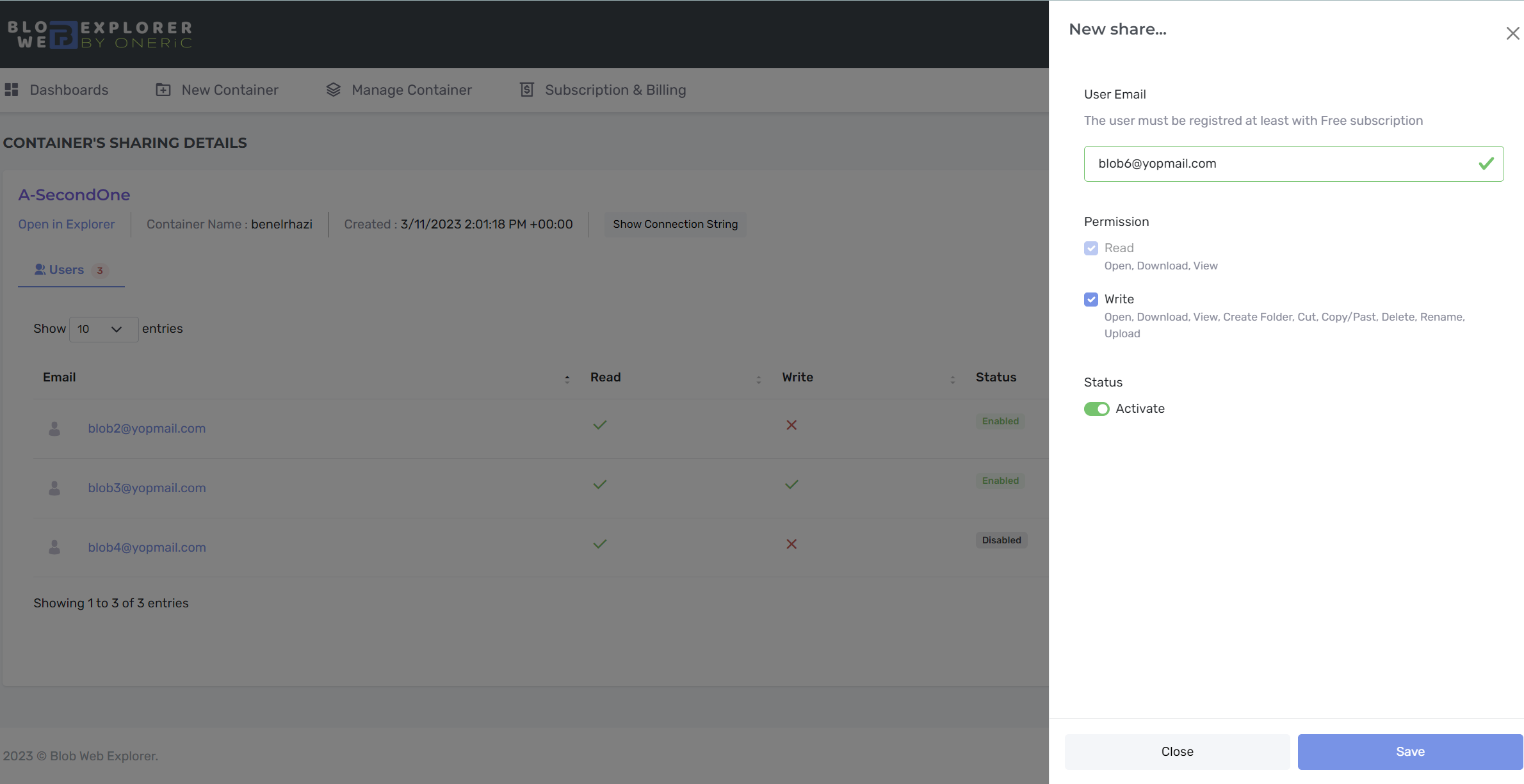 The Blob Web Explorer enables users to share containers with other users registred in the platform just with free plan. No paied plan needed to use shared container as a user.